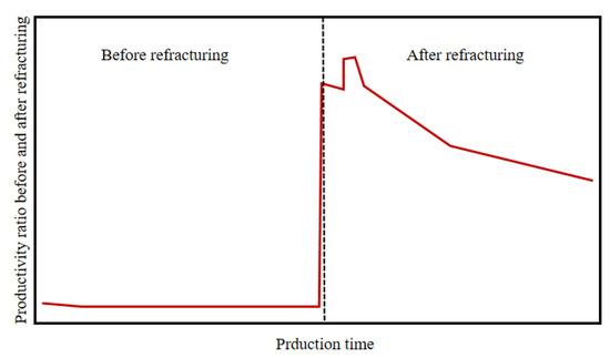 Well selection and layer selection by refracturing are relatively complicated processes because the conditions of each candidate well are different, and the selection basis is closely related to the reservoir properties, the initial stimulation effect, and the production conditions of the candidate well [12]. Robust wellbore conditions lay the groundwork for successful refracturing operations. Wells with a strong material base and a high reservoir pressure are foundational for such endeavors. Reservoirs suffering from extensive damage, along with wells plagued by serious fluid buildup, sand, or scale, are prime refracturing prospects. In the initial fracturing, wells that had suboptimal perforation parameters or were subjected to lower technological standards—evidenced by an imperfect fracturing fluid system, a scanty infusion of sand, or overly spaced fracturing stages—are also ideal candidates. Notably, wells that exhibit an impressive initial production but then experience a rapid decline are marked for potential refracturing benefits [13,14,15,16,17,18,19,20]. In addition, the candidate well should have a reasonable distance from the adjacent well and no severe pressure collusion with the adjacent well, and the horizontal section should not cross the fault. At present, the industry has not reached a consensus on the choice of refracturing time. The refracturing time is generally between 1 and 8 years, most of these values being concentrated between 1 and 4 years, and the production of some wells has decreased to 15% or less of the initial production before refracturing [13]. There are many factors that affect the effect of refracturing, and there is interaction among these factors. Therefore, it is necessary to comprehensively evaluate the impact of these factors on the effect of refracturing [21].