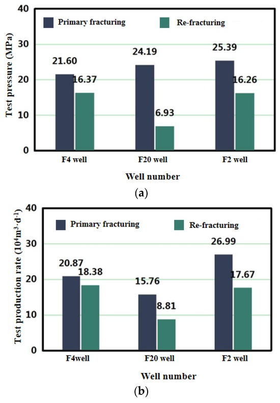 Comparison of test data of refracturing wells in Fuling shale gas reservoir. (a) Test pressure comparison of refractured wells. (b) Refractured well test production comparison.