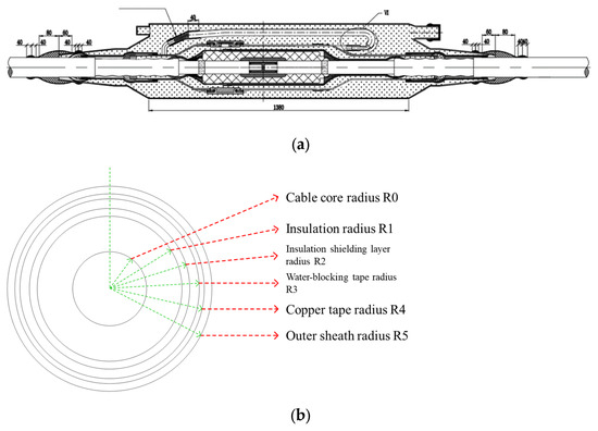 Figure 1. Diagram of the actual connector of the single-core cable. (a) Schematic diagram of the overall structure of the intermediate connector. (b) Cross-sectional structure of single-core cable body.