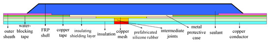 Single-core cable joints and the actual structure of the body are shown in Figure 1; this paper takes FY-YJLW03-Z 64/110 kV 1 × 1200 mm2 cable as a reference and simplifies the actual structure of the cable body and intermediate joints. The body of a single-core cable is composed of the cable core, insulation (including conductor shielding layer), insulation shielding layer, water-blocking tape, copper tape, and outer sheath from the inside out in sequence and single-core cable intermediate joints, including the cable core, compression tube, prefabricated silicone rubber, copper mesh, metal protective shell, sealant, and fiberglass-reinforced plastic shell.