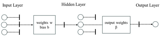 In this Figure 4, circles represent neurons; the lines from the input layer to the hidden layer represent the weights w and bias b; the lines from the hidden layer to the output layer represent the output weights β.