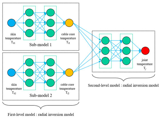 This paper, considering the characteristics of axial and radial heat conduction, designs a cascading inversion model for the hotspot temperature of intermediate joints in single-core cables. The structure of this model, as shown in Figure 5, includes two parts: (1) the radial inversion model (first-level model), which inverses the core temperature of the cable body from the surface temperature, and (2) the axial inversion model (second-level model), which continues to invert the predicted cable core temperature from the radial inversion model to deduce the hotspot temperature at the intermediate joint. The radial inversion model incorporates two sub-models, namely sub-model 1 and sub-model 2, each used to train and learn the relationship between the temperatures at the surface measurement points and their corresponding core temperatures.