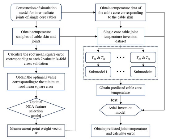 The process of implementing the cascade inversion model is illustrated in Figure 6, which outlines a structured approach to understanding the thermal behavior of a single-core cable’s intermediate joint. This methodology begins by constructing a detailed simulation model of the middle joint of the single-core cable. This model serves as the foundation for generating critical data, specifically the samples of cable skin temperature and joint temperature, which are essential for subsequent analysis.