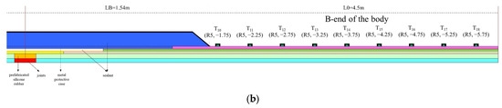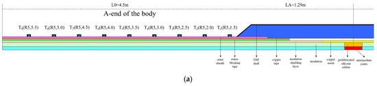 Figure 7. Temperature measurement point distribution of single-core cable skin. (a) Distribution of the location of the skin temperature measurement points at the A end of the body. (b) Distribution of the location of the skin temperature measurement points at the B end of the body.
