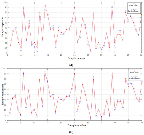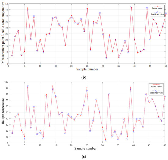 After the training is completed, 50 sets of Tb1 and Tb2 from the test set are input into the first-level radial inversion model (including sub-model 1 and sub-model 2), and the corresponding 50 sets of Tl1 and Tl2 core temperature data are obtained by inversion, which are finally input into the second-level axial inversion model, and 50 sets of joints hotspot temperature Tj data are obtained by inversion. Combined with the original 50 sets of test samples of the core temperature data and the joints hotspot temperature data, the intermediate joints hotspot temperature data are calculated. Combined with the core temperature data and joints hotspot temperature data from the original 50 test samples, the mean square error MSE and goodness-of-fit R2 of the intermediate joints hotspot temperature cascade inversion model are calculated, and the results are compared with those of the joints hotspot temperature inversion method directly through the skin temperature to verify the superiority of the intermediate joints hotspot temperature cascade inversion model proposed in this paper. The training effects and results of the models at all levels in the example simulation experiments are shown in Figure 9.