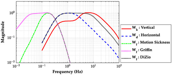 To date, ride comfort and road handling have been regarded as two objectives to be satisfied in suspension design and control [1,2]. The vertical acceleration, az, of a sprung mass (SPM) has been used as a measure for ride comfort. On the other hand, tire deflection has been used as a measure for road handling. Figure 1 shows ISO2631-1, which represents the sensitivity of human bodies to frequency ranges in the vertical and horizontal directions [3,4]. As shown in Figure 1, the frequency range of az related to ride comfort, Wk: vertical, is 4.0~10.0 Hz. For this reason, az within this range should be reduced by suspension control for ride comfort [4].