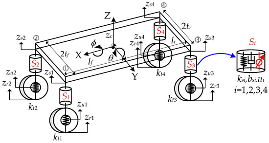 Figure 2 shows a free-body diagram of the full-car model, which has four suspensions, S1, S2, S3 and S4. In the model, there are seven motions: three motions for the SPM and four motions of the unsprung mass (USPM). For the SPM, the VRP motions are described by three corresponding variables, i.e., the vertical displacement, zc, the roll angle, ϕ, and the pitch angle, θ, respectively. In the SPM, the vertical displacements at each corner are described by zs, which is determined by the geometry of the SPM and three variables, zc, ϕ and θ. For the UPSM, the vertical motions are described by the vertical displacement, zu.