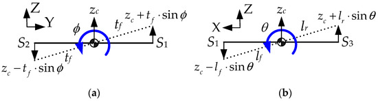 In Equation (1), the vertical displacements and velocities of the SPM at each corner, and , are not a state variable. So, it is to be represented with the state variables, i.e., zc, ϕ and θ. Figure 3 shows how to calculate the vertical displacements of the SPM at four corners, i.e., ➀, ➁, ➂ and ➃ in Figure 2. As shown in Figure 3, zs1, zs2, zs3 and zs4 are derived as in Equation (6) from the geometry of the SPM. In Equation (6), the nonlinear terms are approximated as sinθ ≈ θ and sinϕ ≈ ϕ assuming that ϕ and θ are small. With this approximation, Equation (6) is rearranged into Equation (7) [28,29,32,33]. In Equation (7), the matrix H stands for the geometric relationship among four variables, zs1, zs2, zs3 and zs4, and the three state variables, zc, ϕ and θ.