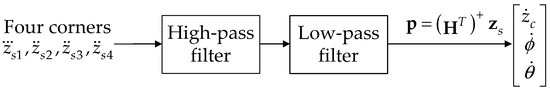 A SOF controller uses available signals measured with sensors in a real vehicle. In this paper, the vertical velocity, the pitch, and the roll rates of the SPM are assumed to be available for SOF control. Those signals are obtained from four accelerometers located at the four corners of the SPM, i.e., ➀, ➁, ➂ and ➃, as shown in Figure 2 [35,36,37]. The signals measured from those accelerometers are filtered sequentially by high-pass and low-pass filters in order to reject noise and DC blocking, respectively. Those filters are given in Equations (22) and (23), respectively [17,35]. As pointed in the reference [35], Equation (22) plays a differentiator role below 0.1 Hz and an integrator role above 0.1 Hz, which excludes a possible DC offset. As a result, the vertical velocities at four corners of the SPM are calculated. With those velocities, the vertical velocity, roll and pitch rates of the SPM are obtained by Equation (11). This procedure of sensor signal processing is shown in Figure 4.