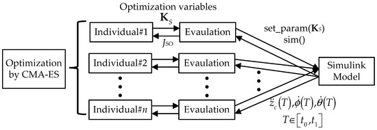 The gain matrices KSOF, KSSOF and KLSOF of the SOF controllers are optimized to minimize J. Those SOF controllers are called LQSOF, LQSSOF and LQLSOF controllers, respectively. To date, it has been shown that there are no analytical methods to optimize KSOF or KSSOF or KLSOF in terms of J [43]. Moreover, it has also been shown that there are no analytic methods to find an initial gain which stabilizes a given system. If one of KSOF or KSSOF or KLSOF is selected, let this be Ks. With Ks, the closed-loop system Ac is calculated as in Equation (29). To optimize Ks, the optimization problem is formulated as in Equation (30) [17,28,29]. In this paper, CMA-ES is applied as a HOM [31].