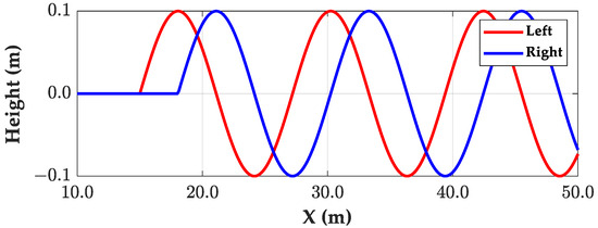 For SLOM, a road profile ought to be selected. In this paper, a twisted sine wave road (TSWR) is selected as a road profile, as given in Figure 6. TSWR has the period of 12.2 m and the amplitude of 0.05 m. In TWSR, the road profile on the right wheels is moved by the quarter period from that on the left ones. As a result, TSWR can simultaneously excite the VRP motions of the SPM. When using TSWR for SLOM, the vehicle speed is set to 15.0 m/s for the purpose of making severe conditions.