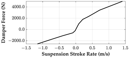 For SLOM, the force characteristic of nonlinear damper in the Simulink model are given in Figure 7. In CarSim, a linear spring was used, and its stiffness was set to 154,000.0 N/m. Those data were references to those of the E-Class sedan model given in CarSim.