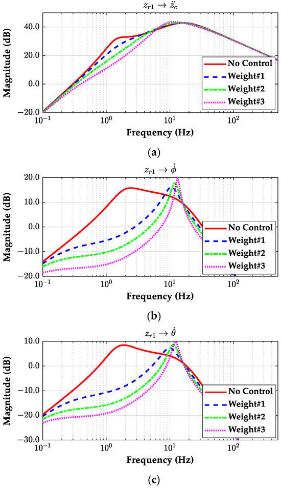 Let the LQLSOF controllers with the three sets of the maximum allowable values, (ξ1, ξ5, ξ7) of (0.2, 0.2, 0.2), (0.1, 0.1, 0.1) and (0.05, 0.05, 0.05) be denoted as Weight#1, Weight#2 and Weight#3, respectively. The other maximum allowable values are set as given in Table 2. Figure 8 shows the frequency responses of those three weight sets from the front left road profile, zr1, to az, and of an SPM. These responses are obtained with the SSE, Equation (18). As shown in Figure 8, the control performance is significantly improved as ξ1, ξ5 and ξ7 are set smaller. From the results, it is recommended to set ξ1, ξ5 and ξ7 as small as possible for ride comfort improvement and motion sickness reduction.