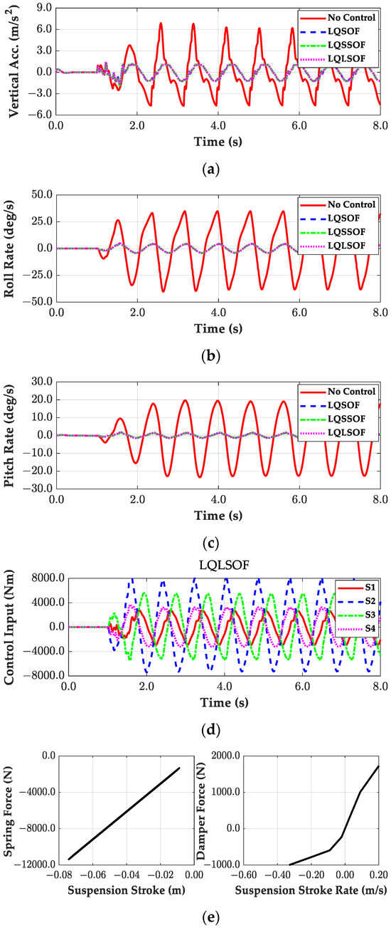 Simulation results of LQSOF, LQSSOF and LQLSOF on the twisted sine wave road in CarSim. (a) Vertical accelerations; (b) roll rates; (c) pitch rates; (d) control inputs; (e) spring and damper forces.