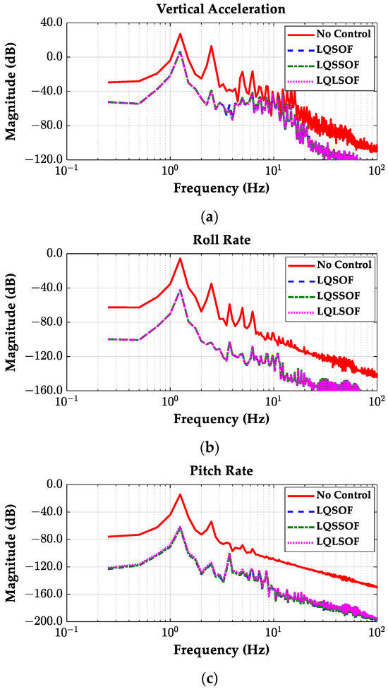 With the simulation results of the LQSOF, LQSSOF and LQLSOF controllers, the frequency responses are obtained as given in Figure 10. As shown in Figure 10, the az, and of an SPM were significantly reduced compared to the uncontrolled case below the frequency of 10 Hz. Especially important, the roll and pitch rates were reduced over the entire frequency range. These results mean that those three SOF controllers significantly improve ride comfort and motion sickness.