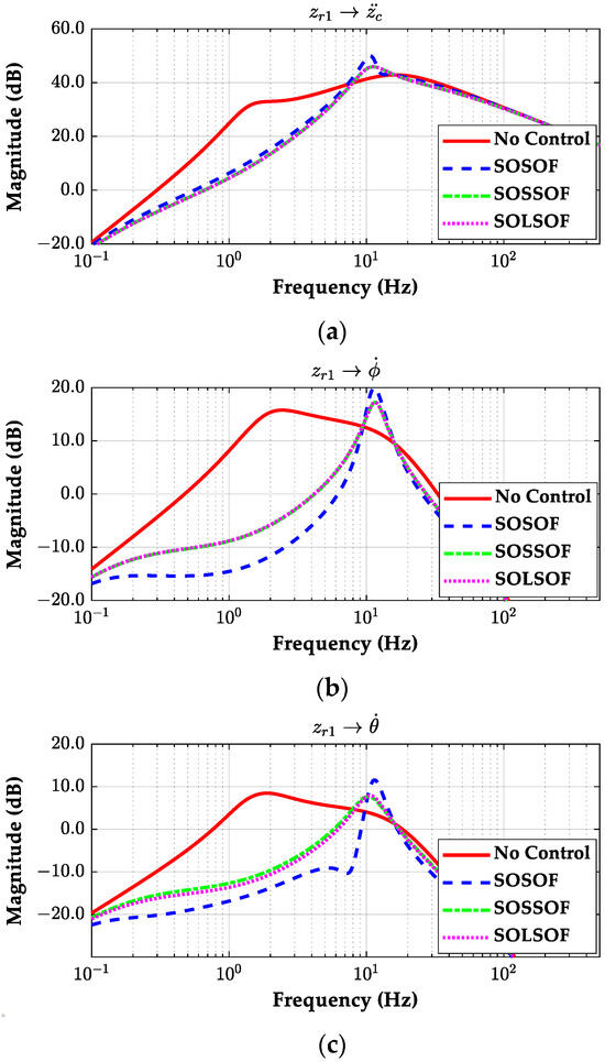 Frequency responses of SOSOF, SOSSOF and SOLSOF designed with SLOM on TSWR. (a) Vertical accelerations; (b) roll rates; (c) pitch rates.