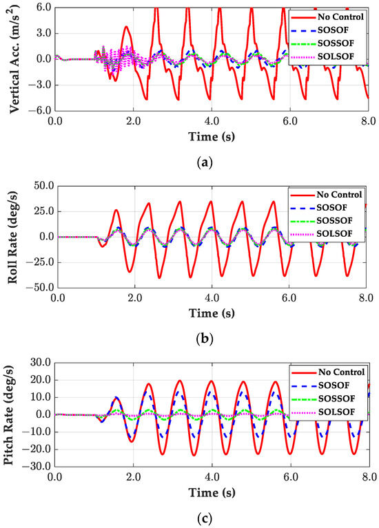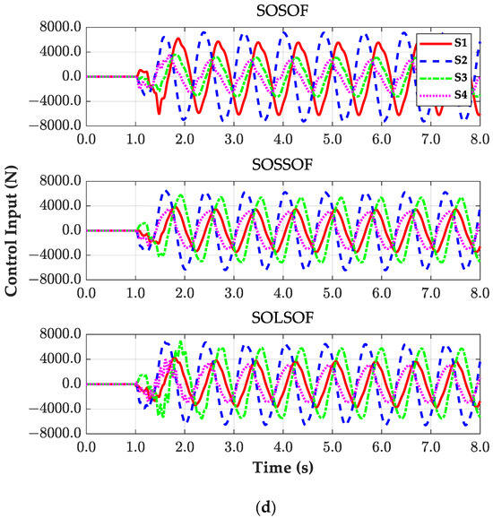 Simulation results of SOSOF, SOSSOF and SOLSOF on the TSWR in CarSim. (a) Vertical accelerations; (b) roll rates; (b) pitch rates; (d) control inputs.