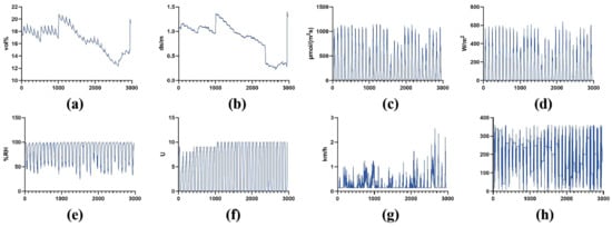 Variation in different features over time: (a) soil moisture, (b) soil salinity, (c) photosynthetically active radiation, (d) total radiation, (e) humidity inside the greenhouse, (f) leaf dampness, (g) wind speed, and (h) wind direction.