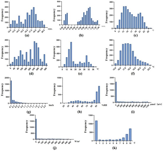 Data distribution histogram: (a) soil moisture, (b) salinity, (c) temperature inside the greenhouse, (d) wind direction, (e) internal temperature of equipment, (f) soil temperature, (g) wind speed, (h) humidity inside the greenhouse, (i) photosynthetically active radiation, (j) total radiation, and (k) leaf dampness.