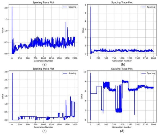 Horizontal comparison of the number of Pareto solutions of the four models. Different horizontal lines represent different Pareto solutions. (a) NSGA-2, (b) NSGA-3, (c) PPS MOEAD DE, and (d) RVEA.