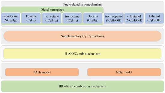 The decoupling method divides the mechanism into three parts: The detailed H2/CO/C1 sub-mechanism is used for predicting the flame propagation rate, heat release rate, and concentration of the major components. The skeletal C4–Cn sub-mechanism is employed for predicting fuel consumption and the stagnation period. The simplified C2–C3 sub-mechanism serves as a transition mechanism between the above two sub-mechanisms. By employing this method, the scale of the mechanism can be reduced, thereby enhancing the efficiency of numerical simulation while ensuring the reliability of the mechanism [23]. As illustrated in Figure 1, the construction of a skeletal mechanism for simulating the combustion of IBE–diesel blends is presented in this section. NC12H26, IC16H34, and IC8H18 represent long-chain hydrocarbons, while C7H8 and C10H18 represent aromatic hydrocarbons. These five components were utilized to characterize diesel, and the physicochemical characteristics of the mixture nearly approximate those of actual diesel [22]. Firstly, the top layer sub-mechanism for iso-propanol, n-butanol, ethanol, and diesel was constructed individually. This was then combined with the PAH model and NOx model, and ultimately coupled with the C1, C2, C3, CO, and H2 sub-mechanism, resulting in the establishment of a comprehensive multi-element skeletal mechanism for IBE–diesel blends.