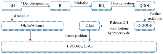 NC12H26, IC16H34, and IC8H18 are classified as long-chain alkane compounds. In this study, the reaction rate constants of specific low-temperature reactions within the iso-octane sub-mechanism, encompassing dehydrogenation, iso-octyl radical oxidation, isomerization, further oxidation subsequent to isomerization, and high-temperature iso-octane and iso-octyl cracking, relied on the mechanism proposed by Dong et al. [24], while the mechanisms governing OH release and ketone hydroperoxide decomposition were primarily derived from Chang et al. [23]. The detailed mechanism of n-dodecane was derived from Ref. Dagaut et al. [25], and the fuel-related mechanism of n-dodecane was developed with reference to it. The CRECK model [26] was employed in formulating the top-level mechanism for iso-cetane, while the high-temperature pyrolysis products and related reactions of iso-cetane were characterized using the reduced mechanism proposed by Fan et al. [27]. The overall reaction pathways of long-chain hydrocarbons exhibit similarity, as illustrated in Figure 2.