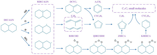 The decalin sub-model pertains to the detailed model established by Dagaut et al. [28], which accounts for the reaction distinctions between low and high temperatures and accurately depicts the oxidation of decalin across a broad temperature range. The primary reaction pathway of decalin is depicted in Figure 3. Owing to the symmetrical structure of decalin, three free radicals can be produced during dehydrogenation, coalescing into RDECALIN. At low temperatures, RDECALIN primarily undergoes oxidation reactions, and the alkyl peroxy radical generated through oxidation undergoes isomerization with RDECOO, resulting in the formation of the hydroperoxyalkyl QDECOOH. QDECOOH produces the C10H17O4 isomer via oxidation, which is collectively represented as ZDECA. ZDECA eliminates hydroxyl and dissociates into KHDECA. Ultimately, the low-temperature reaction chain concludes through the decomposition reaction of KHDECA. At high temperatures, RDECALIN predominantly yields C5H8 and the cyclopentyl cyclopentene DCYC5. C5H8 undergoes dehydrogenation, resulting in the formation of the cyclopentadiene CYC5H6. CYC5H6 reacts with DCYC5, producing C5H5 and A1, both crucial precursors for PAH formation.