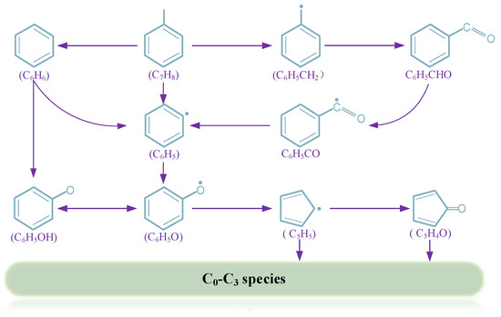 The fuel-related sub-mechanism for toluene is derived from the skeletal diesel mechanism proposed by Dong et al. [24]. Toluene oxidation involves sequential steps, including dehydrogenation to generate benzyl and the removal of methyl groups to produce A1. Benzyl oxidation results in the formation of C6H5CHO, which undergoes further dehydrogenation to produce phenyl. Concurrently, A1 undergoes dehydrogenation to form phenyl. Phenyl is oxidized to generate C6H5O, resulting in ring opening and the production of a small cyclic hydrocarbon, C5H5, which decomposes into C0–C3 substances or smaller species after oxidation (Figure 4).