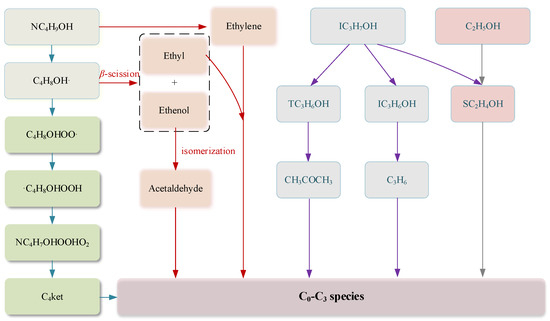 The simplified model for n-butanol was derived from the one comprising four butanol isomers proposed by Chang et al. [31]. It is observed from Figure 5 that n-butanol undergoes dehydrogenation, resulting in the production of n-butyl radicals at low temperatures. Subsequently, oxidation and isomerization processes generate NC4H7OHOO2. The ketohydroperoxide C4ket is produced through the release of OH from NC4H7OHO2. C4ket then decomposes into smaller molecules, including CH2CO, CH2OH, CH2O, and OH. At elevated temperatures, n-butanol undergoes direct decomposition into ethylene and several C0–C3 species. Simultaneously, the β-break reaction of C4H8OH radicals yields ethyl and vinyl alcohol radicals [32]. The highly unstable ethanol undergoes rapid isomerization to form acetaldehyde [33], which further decomposes into smaller species. The ethyl radical undergoes dehydrogenation, leading to the generation of ethylene. Chang et al. [31] consolidated the cleavage reaction at high temperatures into a single reaction, where the primary pyrolysis byproducts include ethylene and OH radicals.