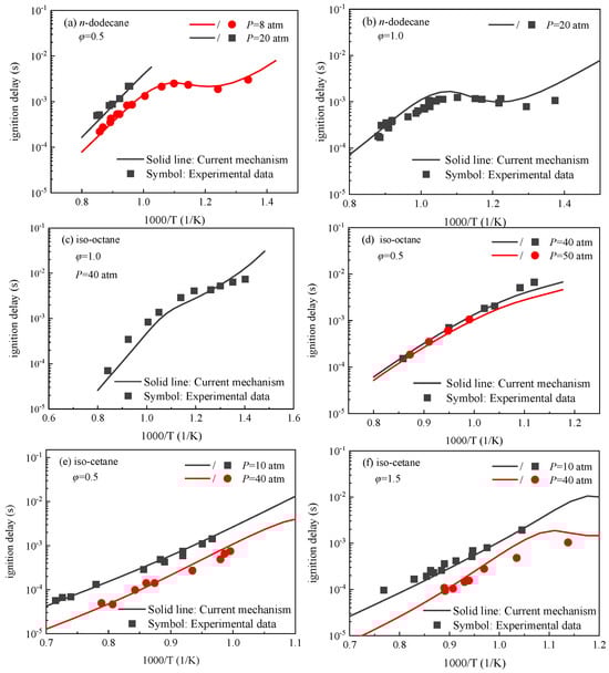Ignition delay is characterized as the duration required for a temperature rise of 400 K compared to the starting temperature. In Figure 6, a comparison is made between the empirically measured and computationally determined ignition delay for n-dodecane [37,38], iso-octane [39,40], and iso-cetane [41]. The accuracy of the prediction results largely conforms to the specified requirements. In Figure 6a,b, it is evident that the current model adeptly captures the negative temperature coefficient (NTC) characteristics of n-dodecane; the predicted n-dodecane ignition delays at various pressures were in agreement with the experimental measurements. In Figure 6c,d, the ignition delay of iso-octane is presented under various pressure and equivalence ratio conditions. At T = 1000~1250 K, φ = 1.0 and P = 40 atm and T = 850~1000 K, φ = 1.5, and P = 40 atm, the results show that the simulated ignition delay of iso-octane is marginally lower than the measured data. However, as can be seen from Figure 6e,f, the simulated value for iso-cetane is slightly higher than the measured value. This is due to the fact that during the fuel-related mechanism development for iso-cetane, a crucial decomposition reaction, specifically IC16KET => IC8H17 + 3C2H4 + CH2O + OH + CO, involving the ketide of iso-cetane was considered.