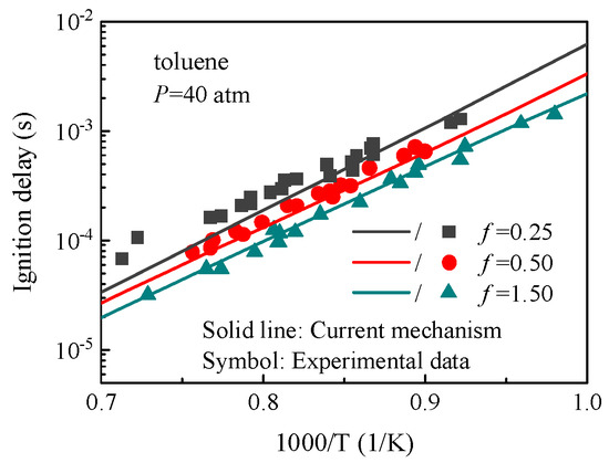 Figure 7 illustrates the simulated and experimental high-temperature ignition delays of toluene at φ = 0.25, 0.5, and 1.0 and 4 atm [42]. Measuring the ignition delay of toluene at low temperatures poses challenges; hence, this study primarily focuses on comparing the high-temperature ignition delay. Despite some errors in the simulation results, they exhibit a good fit with the experimental data and meet the required prediction accuracy.