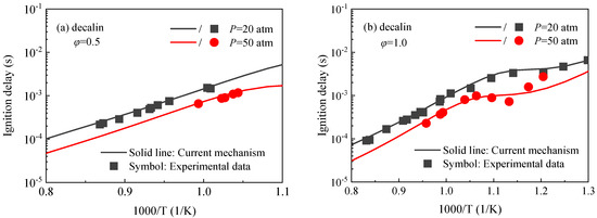 Figure 8 illustrates the comparison between the measured [43] and simulated ignition delays of decalin across 770–1250 K, encompassing the NTC region. The comparisons are made at 20 and 50 atm, as well as φ = 0.5 and 1.0. It is evident that, at 50 atm and φ = 1.0, a noticeable NTC effect occurs. This phenomenon arises because, in the NTC region, the reaction rate of O2 addition to form an alkyl group is significantly influenced by pressure. The mechanism constructed in this study primarily focuses on small molecules related to chain hydrocarbons and their reactions. It does not account for the primary small molecular substances and reactions that occur after the decomposition of the bicyclic structure of decalin. As a result, there is a deviation between the predicted results of the constructed mechanism and the measured data in the NTC region.
