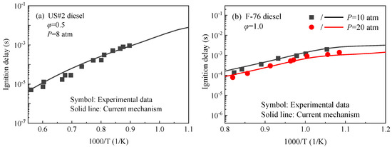 After validating the single-component model, the ignition delay of diesel was also confirmed. As depicted in Figure 9a, the simulation results for US#2 diesel align well with the measured data. However, it is essential to note that the experimental results primarily concentrated on the high-temperature region, and no experimental data were provided for the low-temperature region. Gowdagiri et al. [44] conducted measurements of the hysteretic ignition period for F-76 diesel in a shock tube. It is found from Figure 9b that the simulation exhibited good performance at both pressures, with only minor errors observed in the NTC region at P = 20 atm. One possible reason is the complexity of the actual composition of diesel. Despite using various categories of components to characterize it and considering several diesel fuel properties, it cannot entirely replicate real diesel fuel, leading to inevitable deviations. Additionally, during the mechanism construction, it is significantly reduced to streamline its size and facilitate 3D calculations, introducing some errors in the process. However, in general, the simulated ignition delay of diesel has met the anticipated level of accuracy.