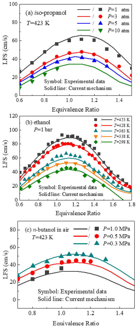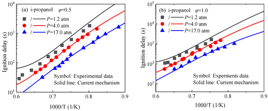The ignition delay for iso-propanol combustion in an oxygen–argon mixture has been obtained from the research conducted by Man et al. [29]. Figure 10 illustrates a comparison between the experimental ignition delay under various pressures and equivalence ratios and the simulated ignition delay by the mechanism. At 1.2 atm, the calculated data slightly exceed the experimental values, though the overall fitting result is satisfactory.