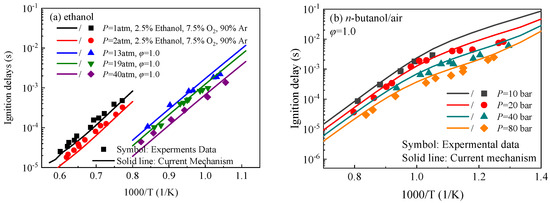 The experimental ignition delay data for ethanol/N2/O2/Ar mixtures under various conditions have been sourced from Mittal et al. [30] and Dunphy and Simmie [45]. It can be seen from Figure 11a that the current mechanism consistently aligns with experimental values at both high and low temperatures, with any slight deviations falling within an acceptable range. The experimental data for n-butanol are derived from the measurements conducted by Heufer et al. [46] and Vrankx et al. [47]. As depicted in Figure 11b, the overall fitting result is satisfactory; however, at lower temperatures, particularly when P = 20 bar, a minor discrepancy is observed. This discrepancy may be attributed to the construction of the mechanism, wherein five isomers of n-butyl are generated after n-butanol dehydrogenation, and only the most crucial one is retained to minimize the mechanism size, thereby decreasing n-butanol consumption paths and delaying ignition at low temperatures. Generally, the prediction accuracy for n-butanol remains acceptable.