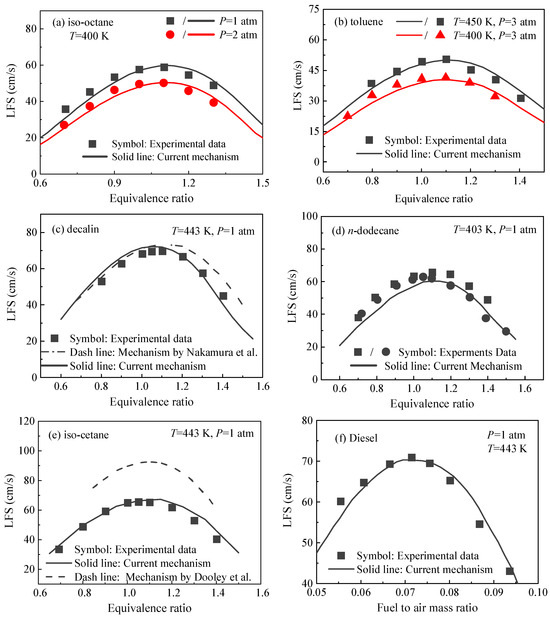 Figure 12 presents the experimental laminar flame speed (LFS) of five diesel components: n-dodecane [48,49], iso-cetane [27], iso-octane [48,50], toluene [51], and decalin [52], alongside the corresponding predicted outcomes. Clearly, the simulated laminar flame speed meets the requirements for n-dodecane, iso-octane, and toluene. A minor disparity persists between the simulated and experimental data for decalin, particularly noticeable at φ = 0.8–1.1, as illustrated in Figure 12c. This arises due to the unique bicyclic structure of decalin, differing from alkanes, as indicated by the current mechanism that inadequately describes the reactions of small species (C0–C3) in relation to it. Nevertheless, there has been a significant improvement in the simulated laminar flame speed of decalin in comparison to the previous model developed by Nakamura et al. [53]. It remains within an acceptable margin of error. The measurement of the laminar flame speed of iso-cetane is seldom encountered in the existing literature. The measured results obtained from a modified CFR octane rating engine, along with the mechanism developed by Dooley et al. [54], were employed to confirm the validity of the model. Figure 12e exhibits some deviations, primarily stemming from the technique’s original design for species identification rather than quantification. In summary, the noted discrepancies notwithstanding, the overall agreement instills confidence in the capacity of the proposed model to effectively depict the oxidation characteristics of the kinetics-controlling pathways for small-molecular-weight compounds in diesel.