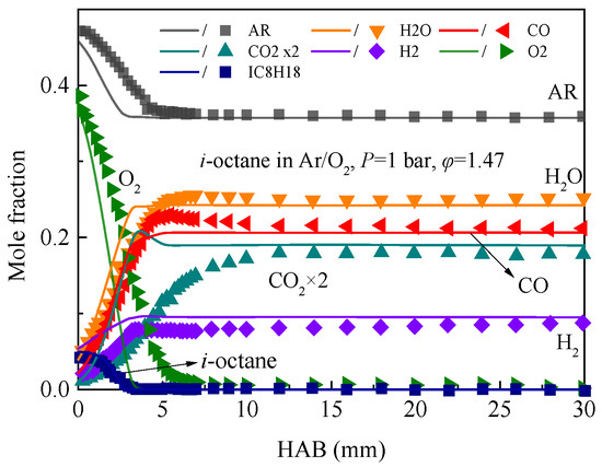 In Figure 14, the mole fraction of primary products from the premixed flame of iso-octane in the O2 and AR mixture at 1 bar and φ = 1.47 is illustrated. It can be seen that the predictions of the mechanism for the molar fractions of most species are very close to the experimental measurements. The figure underscores the reliability of the current iso-octane sub-mechanism [61].