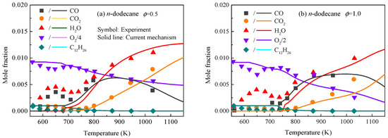 Figure 15 presents the mass distribution concentration of the n-dodecane premixed flame within 550–1150 K at 10 bar and various equivalence ratios [62]. The consumption of n-dodecane and the concentration changes of key products align closely with the experimental values under two equivalence ratios.