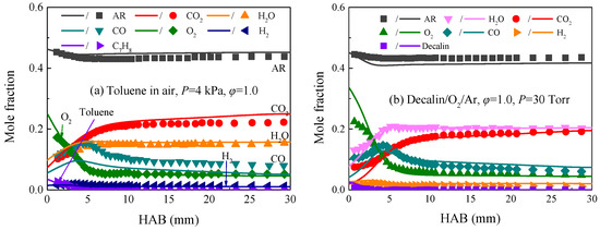 The measured and simulated species profile in the premixed flame of toluene and decalin.