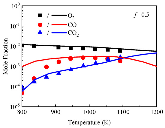 Mati et al. [67] conducted a study on diesel oxidation under conditions of 10 atmospheres and in a JSR with a fixed residence time of 0.5 s and an equivalence ratio of 0.5. The test fuel used was a synthetic diesel oil mixed with various oil solvents, resembling commercial diesel. In Figure 18, it is evident that the existing DFS mechanism impeccably reproduces the O2 concentration history. Similarly, the current mechanism accurately predicts the peak value of CO history, with a slight overestimation observed at low temperatures compared to the experimental values.