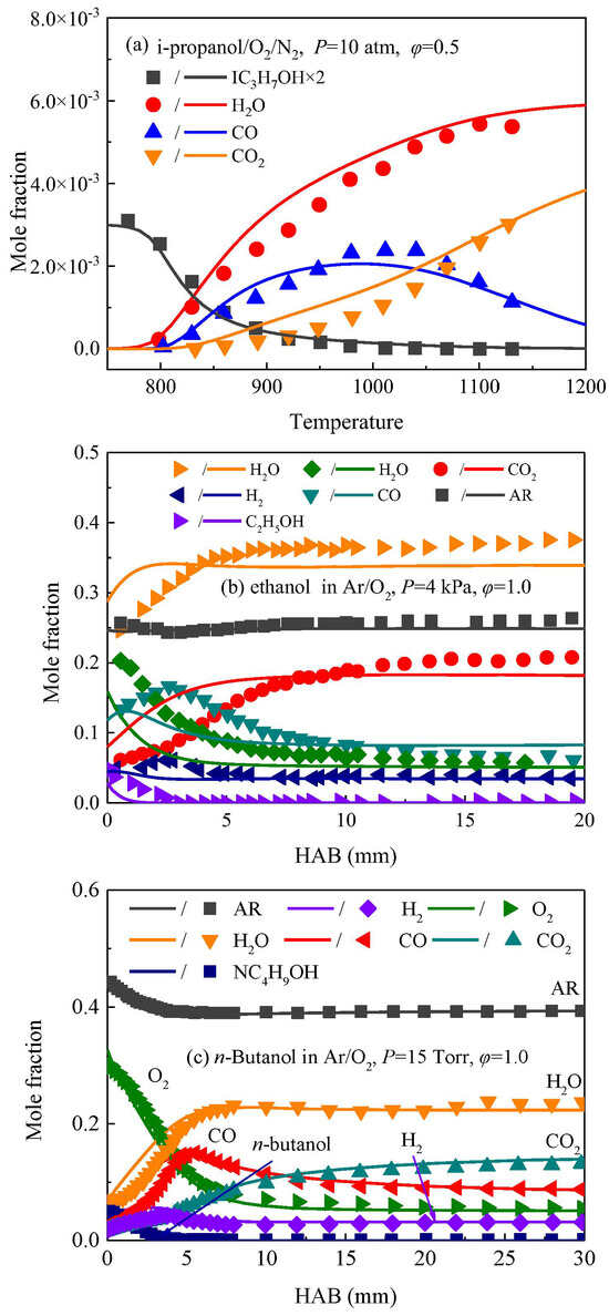 The experiment involving the premixed flame mass concentration distribution of iso-propanol was conducted in a JSR [68]. In Figure 19a, a comparison is made between the concentration distribution of iso-propanol, CO, CO2, and H2O in the experiment and simulation. Figure 19b illustrates the component concentration distribution of ethanol during combustion in an O2 and AR mixture. The predicted values generally align well with the experimental results. The component concentration distribution test results for n-butanol are sourced from Hansen et al. [69]. It is evident from Figure 19 that the IBE sub-mechanism yields accurate predictions, effectively capturing the concentration changes of small molecular components during combustion.