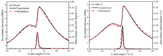 The accuracy of the three-dimensional model, coupled with the current mechanism, was verified by comparing the cylinder pressure and heat release rate between the experimental and simulated data. Table 1 presents the engine specifications and operation conditions. As illustrated in Figure 21, the simulation results demonstrate a generally consistent trend with the measured values in terms of the in-cylinder pressure and heat release rate. Any slight discrepancies could be attributed to the omission of turbulence effects on chemical kinetics. The figure highlights that the mechanism developed in this study, when coupled with the numerical model, effectively reproduces the combustion characteristics of IBE–diesel blends in the engine.