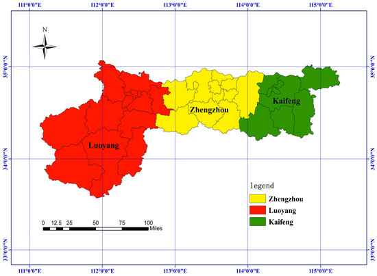 The Zheng–Bian–Luo urban agglomeration strategically occupies a position in the Central Plains region, intersecting both the Beijing–Guangzhou Railway and the Longhai Railway. It acts as a crucial link connecting the Central Plains Economic Zone to the Yangtze River Delta Economic Zone. Situated in eastern China’s heartland, this region is adjacent to the plains of the middle and lower reaches of the Yellow River, enjoying an advantageous location and superior transportation infrastructure. Since the advent of economic reforms and opening-up policies, the Zheng–Bian–Luo region has expedited its industrialization and urbanization processes, capitalizing on its advantageous geographical position. Currently, the “two cities and one prefecture” consisting of Zhengzhou, Kaifeng, and Luoyang have merged to form the central urban hub within the Central Plains region [33,34,35].