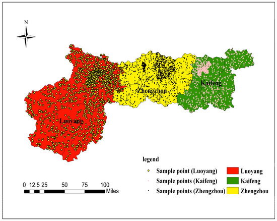 Spatial Distribution Map of Soil Sampling Sites in the Zheng–Bian–Luo Urban Agglomeration. (The illustration was crafted utilizing ArcGIS software, version 10.2. For further reference, the URL link is provided: https://www.arcgis.com/index.html, accessed on 1 March 2024).