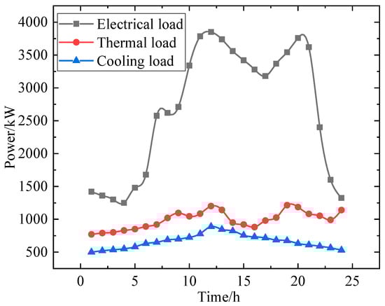 This paper uses the YALMIP toolbox in the MATLAB platform to establish the mathematical model of the IES, and then adopts the commercial solver CPLEX to solve the two-stage DRO model in MATLAB (R2020A). This section takes a typical day of IES in northern China as an case, with a planning period of 24 h and a time interval of 1 h. The time of use electricity price and natural gas price are shown in Table 1. The relevant parameters of various equipment are shown in Table 2, and the technical parameters are shown in Table 3. The power curves of different energy demands is given in Figure 3. It should be noted that only the GB produces thermal power, while the remaining equipment generates electrical power. The corresponding cooling/heating power can be calculated based on the conversion efficiency given in Table 3.