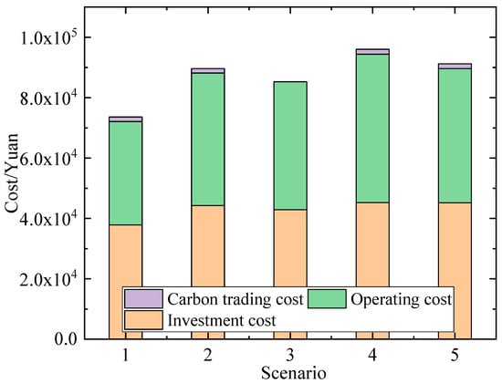 Compared with scenario 5, scenario 3 shows an increase in both investment and operating costs after considering the tiered carbon trading mechanism. The total cost of Scenario 5 has increased by 6.46%, while carbon emissions have decreased by 15.7%. This is because, without considering the carbon trading mechanism, the system is no longer equipped with P2G and CCS equipment due to economic considerations. Although the total cost of the system has increased after considering the tiered carbon trading mechanism, carbon emissions have significantly decreased. The system chooses to allocate clean equipment with lower carbon emissions under the economic pressure of carbon trading costs to achieve energy conservation and emission reduction as much as possible, which is in line with the direction of energy development.