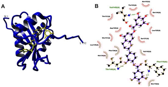 SilymarinProcesses 12 01047 i003482.42.4−9.88−41.3357.7Thr140, Gly138, Glu108, Thr123Ala120, Ser121, Val142, Asp122, Cys77, Phe139