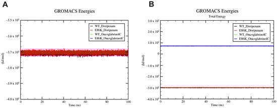 Molecular dynamic (MD) simulations have been executed for the best two drug-binding molecules OncoglabrinolC and Doripenem with the aacA7 protein. To corroborate the binding stability of the protein–ligand complex, we performed an MD simulation of 100 ns each for wild and mutated complexes of aacA7–OncoglabrinolC and aacA7–Doripenem. The well-minimized equilibrated structure was used to perform docking studies; furthremore, all-atom MD simulations were performed to nullify any type of bias that could be felt during the experiment. All-atom 100 ns simulation is enough to get into the dynamic picture of a small protein–ligand complex. Potential energy analysis was performed during the 100 ns MD simulations for all the complexes. This plot shows that all the trajectories were stabilized and remained stable throughout the 100 ns simulation run, as observed in Figure 4A. The total energy of the whole system (Figure 4B) also suggested stable trajectories for all four protein–ligand complexes.