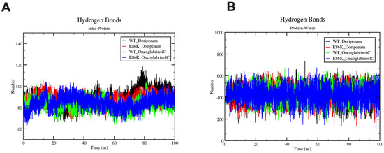 Figure 6A demonstrated the pattern for hydrogen bonding seen during 100 ns simulation in all four intra-protein complexes. The most numbered H-bonds were monitored in the case of the WT–Doripenem complex, and the least number of H-bonds were examined in the WT–OncoglabrinolC complex. Figure 6B displays the number of H-bonds formed between the protein and the surrounding solvent.