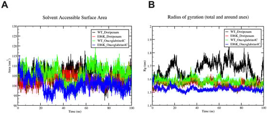 Figure 7. SASA plot (A) and radius of gyration plot (B) for WT and mutated aacA7 protein in complex with OncoglabrinolC and Doripenem drug molecules.